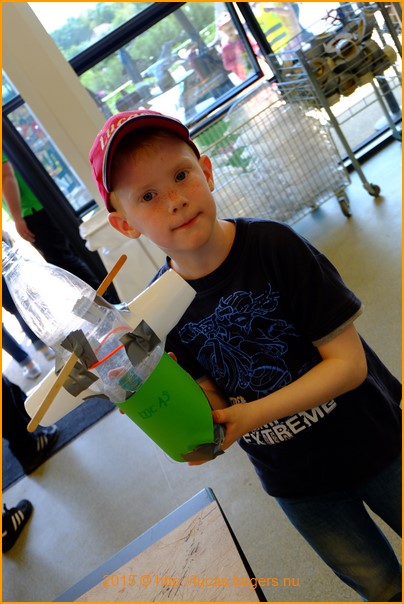 Lucas heeft een waterraket gemaakt en schiet hem de